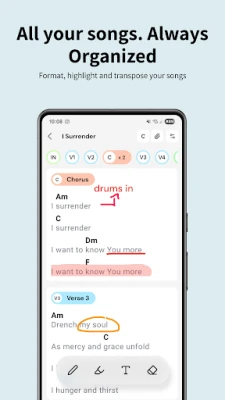 - Custom Arrangements: Add performance notes and reorder the song's structure (Verse, Chorus, etc.) to match your unique arrangement.